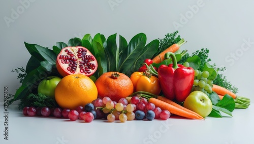 Different fresh fruits and vegetables floating in the air against a background.
