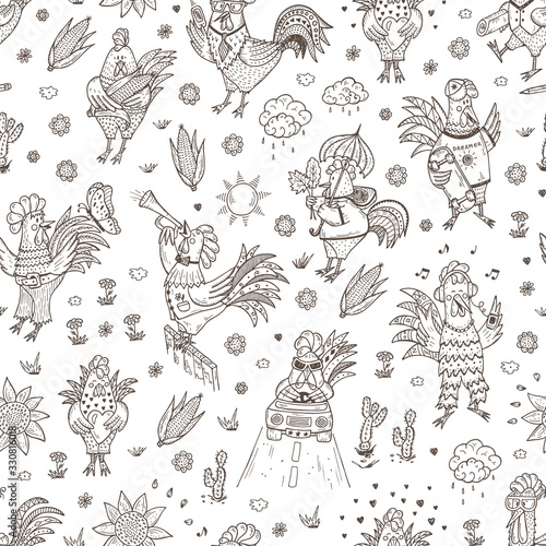 pattern, rooster, cock, chicken, doodle, animal, autumn, background, bird, businessman, butterfly, car, chick, corn, countryside, crow, cute, domestic, draw, drawing, endless, fall, farm, feather, goggles, harvest, hipster, holiday, leisure, music, nature, object, rain, repeating, road, seamless, skateboard, student, summer, sun, sunflower, sunglasses, symbol, trumpet, umbrella, vector, wallpaper, weather, year