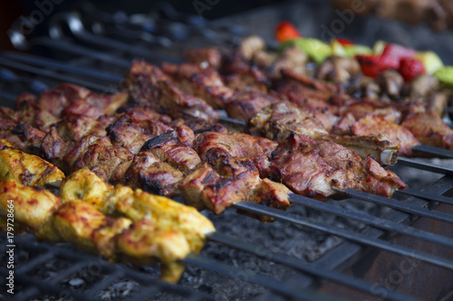 bar-b-q, meat, grill, view, food, bar-b-q, shashlik, skewer, bar-b-q, skewer, beef, hot, grilled, meal, onion, pork meat, dinner, green, shish, grilling, kebob, background, nobody