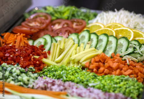 Different raw shredded vegetables and fruits as an example of a healthy diet