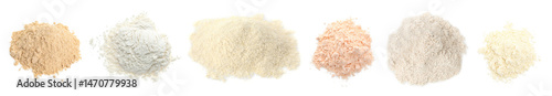 Different types of flour isolated on white, set. Top view