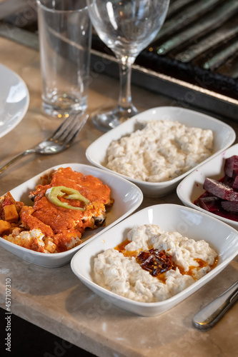 Different types of meat grilled on Barbecue on the table, Served with special Turkish appetizers and Turkish raki.