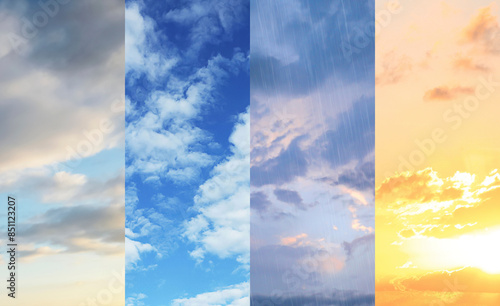 Different weather conditions due to season changing. Collage with photos of sky
