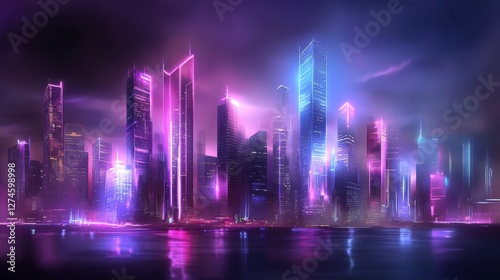 Digital art of a glowing city skyline with cyberpunk colors and deep shadows