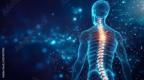 spine, vertebra, spinal, anatomy, human, body, digital, art, illustration, futuristic, medicals, technology, science, blue, dark, background, highlight, red, pain, disease, structure, contour, point, line, surface, design, abstract, modern, health, innovation, skeleton, detail, visualisation, graphic, concept, cyborg, enhancement, precision, diagnostic, neural, system, organic, synthetic