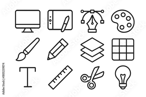 digital, art, tool, icon, line, outline, icon, set, computer, monitor, tablet, pen, tool, colours, palette, paintbrush, crayons, layer, grid, typography, ruler, scissors, light
