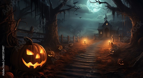 artwork, depict, mysterious, forest, clear, halloween, night, jack, lantern, to illuminate, rock, full, bat, fire, gate, soul, frightened, ghost, vine, moon, fence, treat, spell, trick, smoke, dark, leaves, grass, moss, tree branch