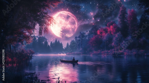 Digital artwork of a serene and mystical night scene features a small boat with a silhouetted figure paddling on a calm lake surrounded by dense, dark forest on both sides creating a dreamy atmosphere