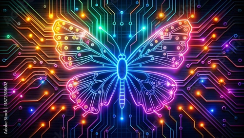 butterfly, circuit board, digital, technology, neon, abstract, design, art, artificial intelligence, ai, cyber, futuristic, innovation, connectivity, network, datum, information, science, science fiction, electric, glowing, colourful, vibrant, bright, illustration, graphic, background, pattern, texture, symbol, metamorphosis, transformation, evolution, cyberspace, web, communication, computing, microchip, motherboard, electronic, engineering, high technology, future, digital artwork, rendering, artificial