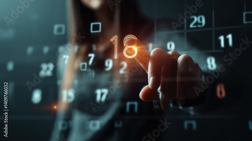 Digital calendar interaction with finger selecting 18th date, showcasing technology and modern scheduling