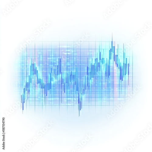 Digital candlestick chart with blue grid lines and glowing candlesticks, floating on a pure white background