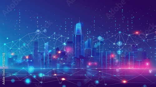 city landscape, network, technology, digital, future, urban, futuristic, connected, smart, city, skyscraper, building, datum, communication, cyberspace, web, virtual, abstract, illustration, design, graphic, art, blue, purple, night, line, point, glowing, neon, style, modern, concept, innovation, progress, global, evolution, transformation