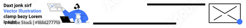 workflow, messaging, technology, collaboration, laptop, person working, electronic mail, metaphor, business, concept, flat, web, simple, blue, black, landing, page, banner, text, website, vector, illustration, icon