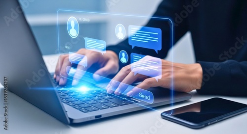 Digital Communication: A person uses a modern laptop, interacting with glowing, futuristic digital interfaces and instant messaging, the scene exudes the fast pace of technological advancement.