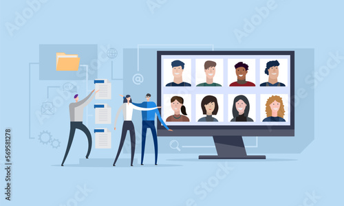 Digital communication, business concept office online, remote meeting computer, laptop work, vector illustration