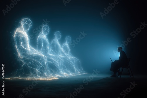 ai, artificial intelligence, hologram, dialogue, digital, near future, science fiction, technology, innovation, cognition, businessperson, consulting, philosophical, calm, silence, cyberspace, suit, smart, stylish, presentation, high technology, networking, decision-making, advanced technology, question, light, art, concept