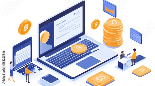 exchange, platform, laptop, computer, digital, money, finance, online, banking, technology, cyberspace, transaction, trading, billfold, investment, market, business, user, people, person, man, woman, working, team, desk, coin, stack, dollar, currency, payment, secure, global, growth, future, innovation, network, virtual, asset, economy, financial, system, graphic, isometric, illustration