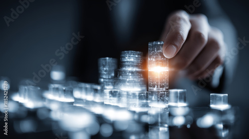 Digital currency concept with hand stacking glowing cubes representing financial growth and investment
