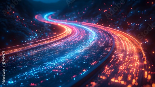 Digital data flow on the road in the concept of cyber global communication and coding with graphic creating vision of fast-speed transfer to show agile digital transformation and disruptive innovation