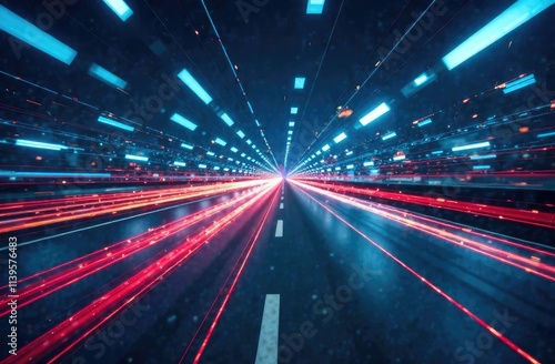 Digital data flow on the road with motion blur to create a vision of fast data transfer. Concept of future digital transformation, revolutionary innovation and flexible business.