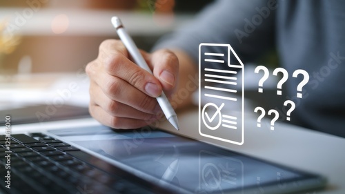 document, review, question, tablet, stylus, digital, uncertainty, checklist, check, mark, technology, device, screen, hand, person, working, office, business, analysis, investigation, solution, problem, process, workflow, information, datum, feedback, query, researching, doubt, questioning, consideration, decision, choice, evaluation, assessment, verification, validation
