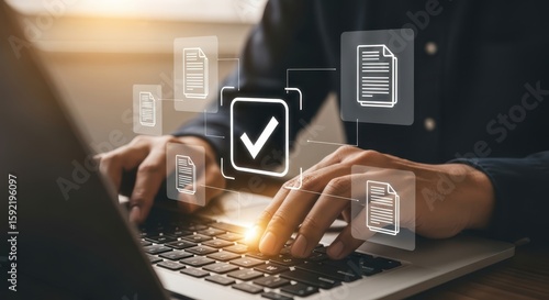 laptop, hand, document, icon, automation, thinks, resource, task, review, operation, transfer, connectivity, enterprise, approval, progress, efficiency, agree, software, typing, computing, mark, solution, keyboard, virtual, innovation, interface, management, process, system, save, futuristic, network, screen, electronic, input, protection, information, application, success, service, datum, transformation, corporate, connection, cyberspace