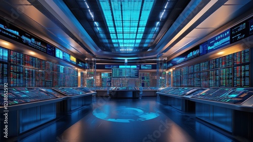 Digital economy, virtual reality trading floor, 3D illustration.
