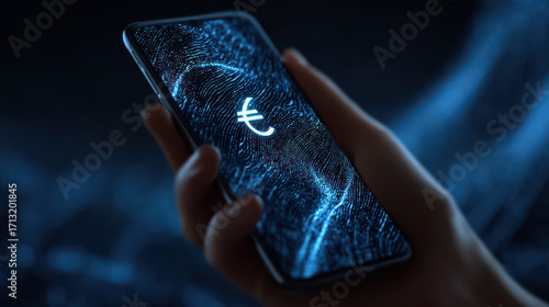 Digital Euro in Hand: A close-up shot captures a hand delicately holding a smartphone displaying the Euro symbol, showcasing the fusion of finance and technology.