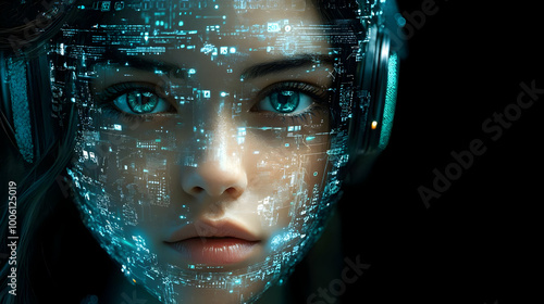 Digital Face with Blue Eyes in a Futuristic World