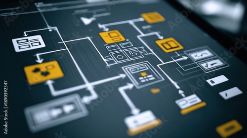 digital, flowchart, tablet, system, diagram, design, process, interface, connection, network, information, datum, software, technology, visual, graphic, modern, organised, abstract, layout, structure, connection, line, box, icon, buttons, automation, workflow, management, business, procedure, planning, strategy, flow, detail, complex, clear, structured