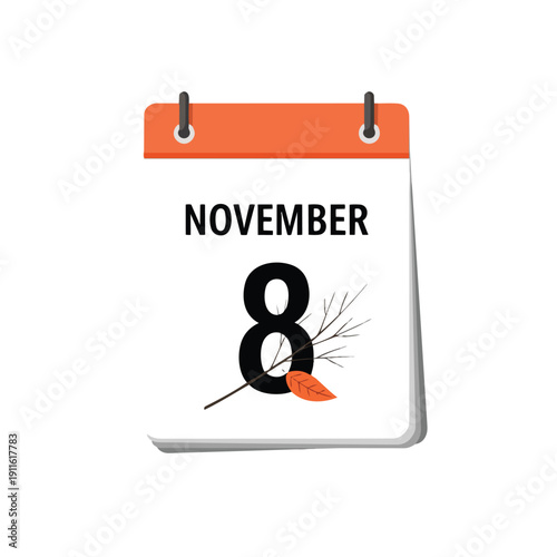 calendar, november, eighth, autumn, leaf, date, day, month, schedule, reminder, seasonal, fall, icon, graphic, illustration, symbol, time, event, planning, appointment, deadline, specific, isolated, white, background, orange, black, number, text, flat, minimal, simple, modern, paper, page, abstract, celebrate, holiday, 8, twig, tree branch, dry, october, september, winter, period