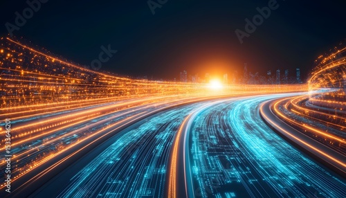 digital, blue, route, communication, urban, pattern, design, curve, datum, speed, future, futuristic, illustration, city, light, network, motion, orange, line, glow, information, abstract, tunnel, vibrant, modern, highway, graphic, system, bright, night, technology