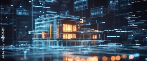 digital, model, house, home, building, architecture, blueprint, design, modern, futuristic, technology, innovation, construction, real estate, property, estate, future, datum, network, interface, software, three-dimensional, render, illustration, abstract, concept, line, wireframe, light, glow, window, night, dark, background
