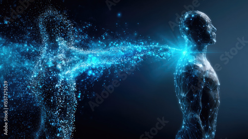 artificial, intelligence, technology, futuristic, human, digital, datum, network, connection, information, abstract, science, cyber, brain, mind, consciousness, energy, light, blue, glowing, particle, stream, transformation, evolution, creation, disintegration, reconstruction, body, silhouette, head, profile, wireframe, mesh, geometric, pattern, concept, background, dark, neon, biotechnology, robotic, virtual, reality, art, design, communication, global