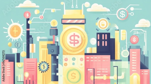 Digital illustration of a colorful cityscape with financial symbols and skyscrapers, representing economic growth and technology.