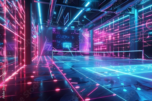 Digital illustration of a futuristic room with neon lights illuminating the high-tech interior design, A futuristic digital illustration of a high-tech pickleball court with holographic elements