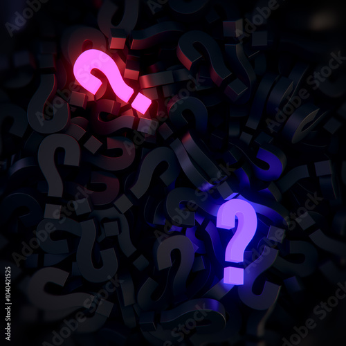 Digital illustration of randomly placed three-dimensional question marks in dark colors and two brightly glowing question marks in neon pink and purple. 3d rendering