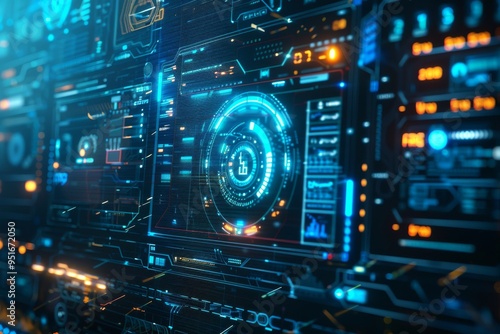 Digital interface, blue holograms, futuristic technology, data visualization, high-tech, cybernetic design