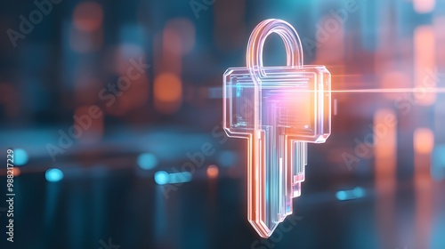 Digital key authentication. Modern technology background with futuristic key icon holographic code. CGI 3D render