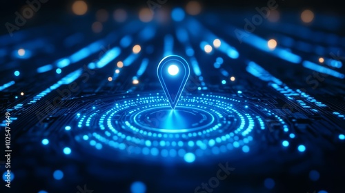 Digital Location Pin on Circuit Board with Blue Neon Lights