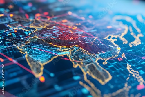 datum, connection, network, map, asia, digital, earth, continent, global, communication, technology, cyberspace, information, line, point, glowing, abstract, futuristic, modern, background, design, pattern, blue, red, yellow, orange, light, bright, dark, screen, display, interface, graphic, illustration, visualisation, concept, connection, dot, node, flow, movement, dynamic, vibrant, tech, innovation