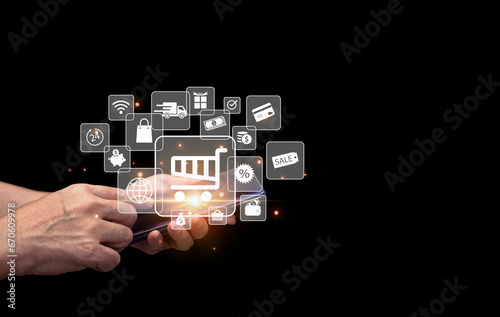 Digital marketing. Businessman using smartphone wtih global circle interface payment online shopping and finance icon for customer network connection. Data exchanges. Business innovation.