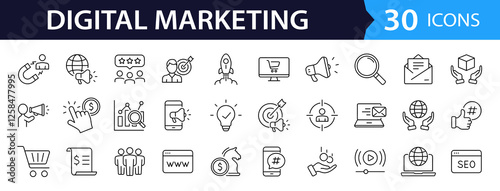 Digital marketing set of web icons in line style. Marketing icons for web and mobile app. Communication, advertising, ecommerce, seo, content, product, target audience, website, social media and more