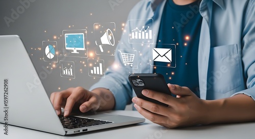 laptop, phone, digital, marketing, business, strategy, icon, technology, hand, online, commerce, growth, datum, analysis, chart, graph, computer, mobile, device, screen, cyberspace, communication, social, media, network, connection, electronic mail, shopping, cart, megaphone, monitor, bar, statistic, trend