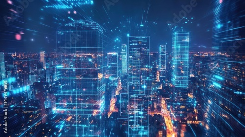 city landscape, night, futuristic, digital, technology, metropolis, urban, modern, network, connection, datum, information, skyscraper, building, light, glow, blue, dark, cyber, innovation, progress, future, global, earth, communication, cyberspace, online, electric, energy, power, speed, fast, dynamic, abstract, graphic, design, illustration, artistic, creative, visual, scene