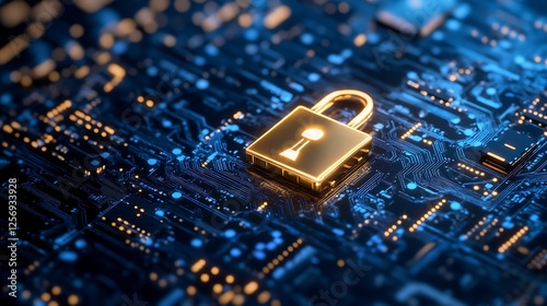 Digital padlock secured on a circuit board symbolizing cybersecurity and data protection in technology : Generative AI