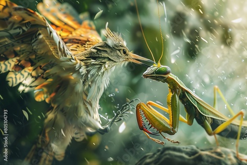 songbird, praying mantis, collage, detailed, wildlife, nature, bird, insect, digital artwork, painting, illustration, feather, wing, realistic, naturalistic, fierce, intense