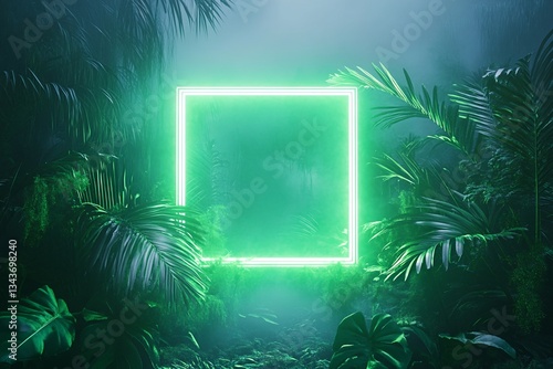 neon, square, frame, green, tropical, foliage, plant, leaf, palm, jungle, fog, hazy, atmosphere, digital, rendering, lighting, glow, bright, dark, scene, background, nature, environment, abstract, modern, graphic, design, element, illustration, image, visual, artwork, template, three-dimensional, render, space, empty, border