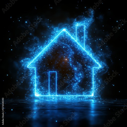 house, glowing, cosmic, outline, digital artwork, dark background, star, nebula, surreal, illustration, blue, light, abstract, design, technology, space, creativity, fantasy, illumination, home, environment, atmosphere, magic, visual, contemporary, effect, energy, shape, architecture, dreamy, aesthetic, aglow, night, spirituality, concept, modern, craft, rendering, universe, art, pattern, composition, innovation