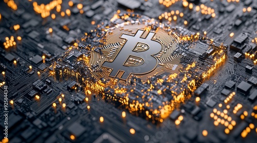 Digital representation of Bitcoin on a microchip with glowing elements